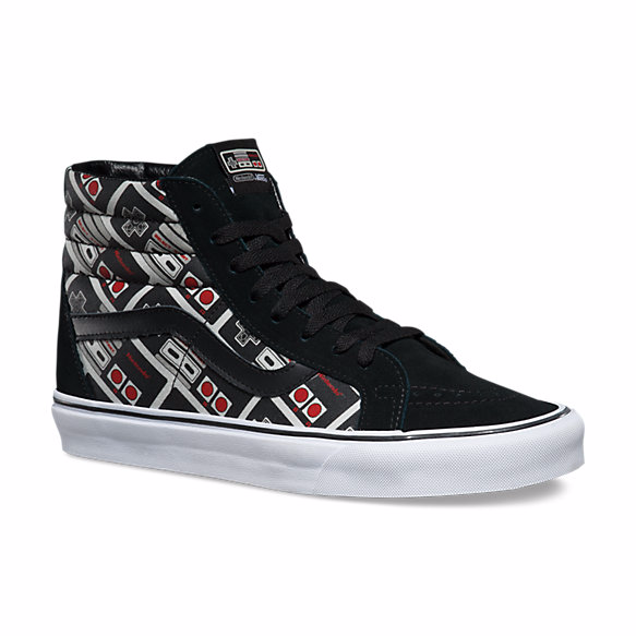 Showcasing 8-bit artwork of Nintendos iconic characters, the Nintendo Sk8-Hi Reissue combines the reissued legendary Vans high top with a classic controller print, canvas and suede uppers, padded collars, and custom GAME OVER signature rubber waffle outsoles.